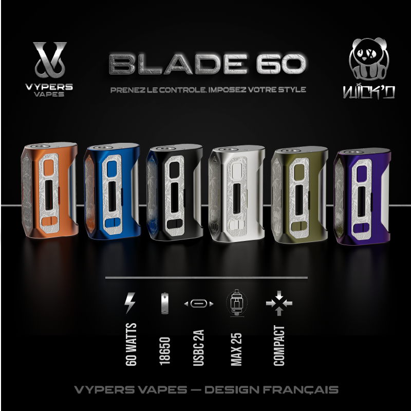 Conçu en France par Vypers Vapes, et fabriqué avec des partenaires industriels de référence en Chine suivant un cahier des charges strict (tests fonctionnels 100 % en fin de ligne, contrôle visuel & dimensionnel, CE et ROHS), Blade60 offre un niveau de finition et de fiabilité au-dessus des standards de son segment.