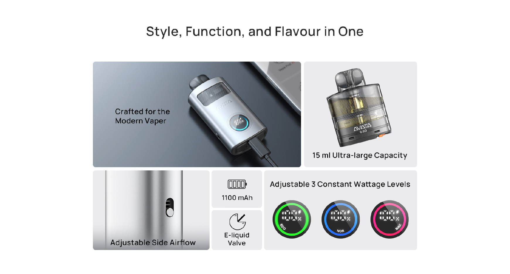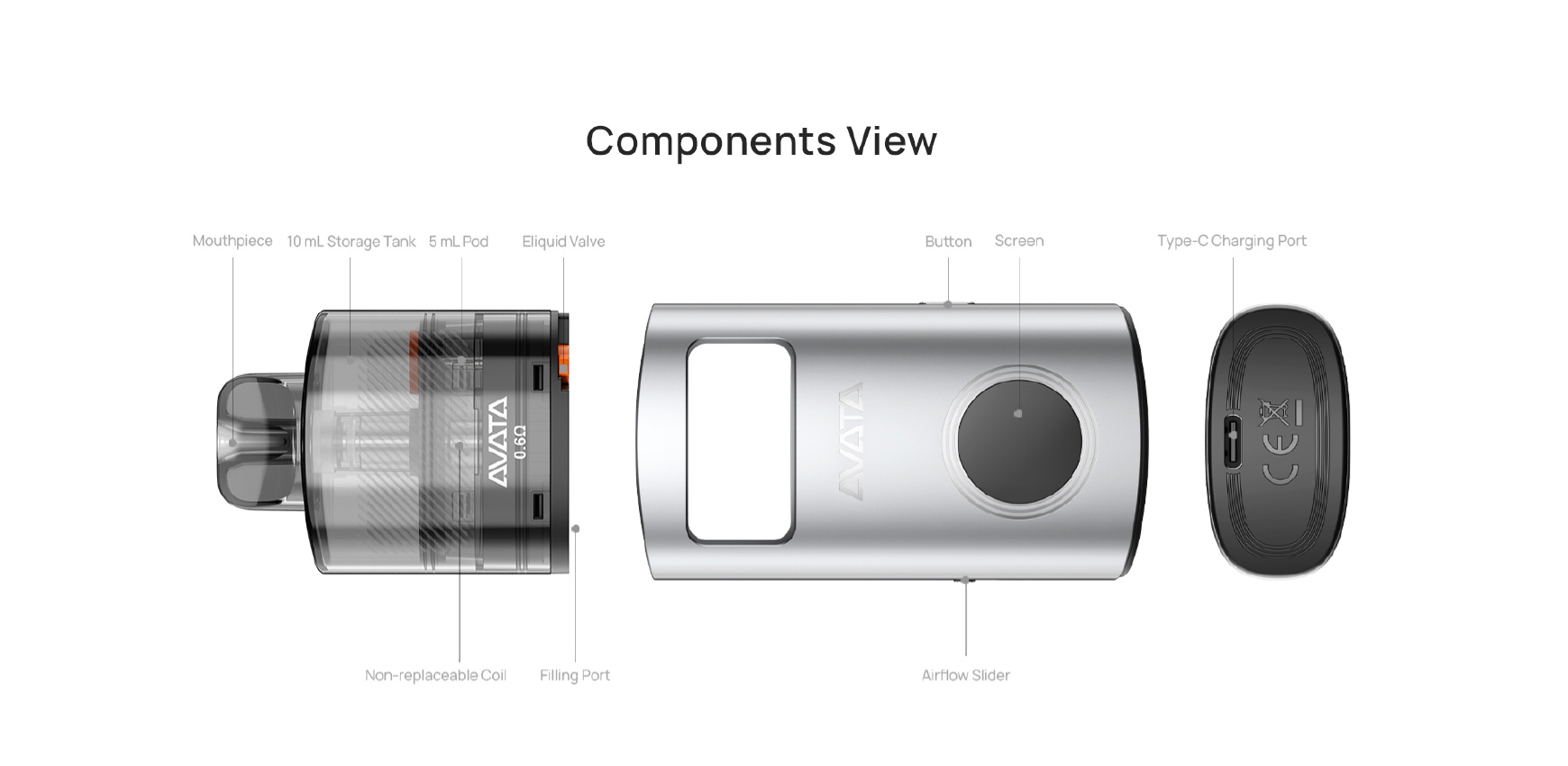 Le podAvata se combine parfaitement avec la cartouche dédiée Avata, offrant une grande capacité de 15 ml pour la version standard et 2 ml pour la conformité TPD — garantissant à la fois une utilisation prolongée et le respect des réglementations.