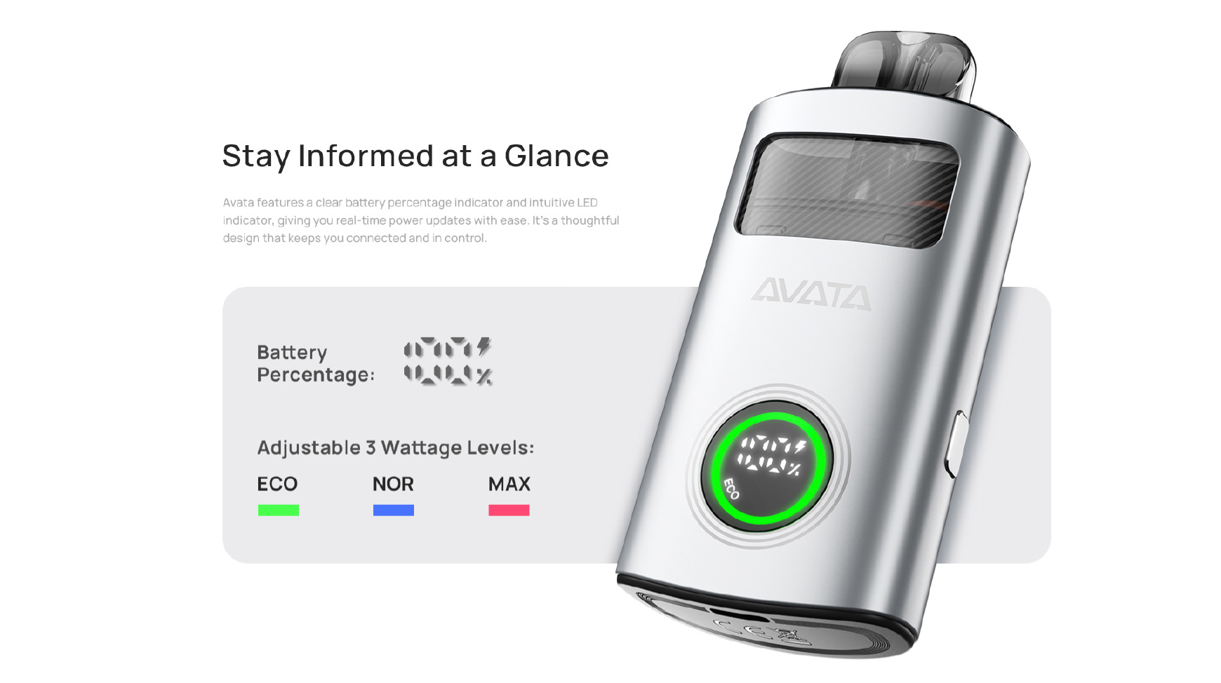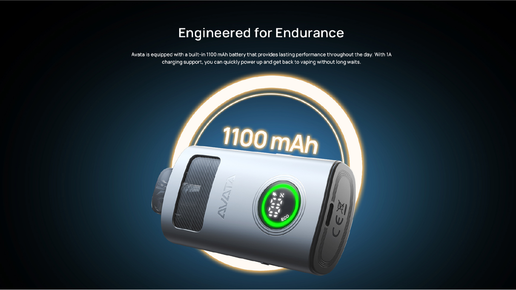 Avata est doté d’une batterie intégrée de 1100mAh qui assure des performances durables tout au long de la journée. Grâce à la prise en charge de la charge rapide 1A, vous pouvez recharger rapidement votre appareil et reprendre la vape sans attendre longtemps.