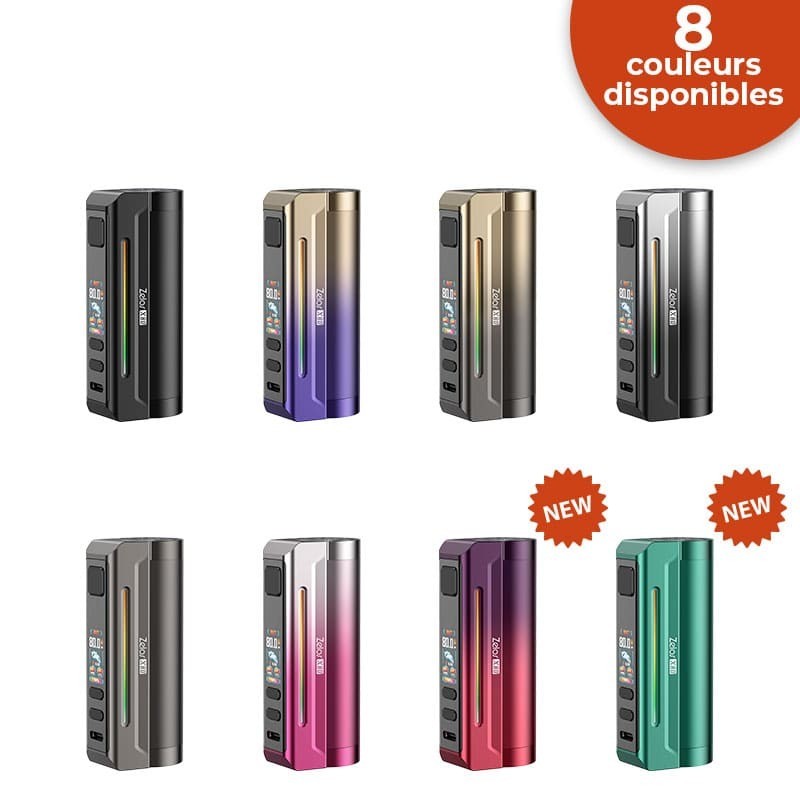 La box Aspire Zelos X80 offre jusqu’à 80W de puissance réglable avec 5 modes (VW, Bypass, TC, CPS, V). Il intègre un écran couleur TFT 0.96" et fonctionne avec un accu 18650 (non fourni).