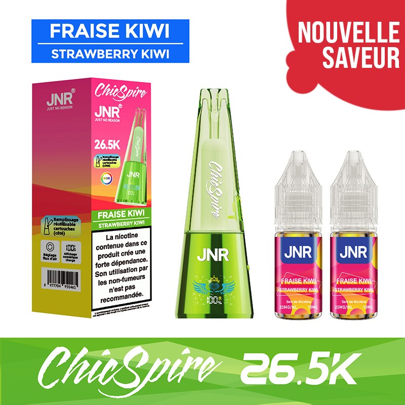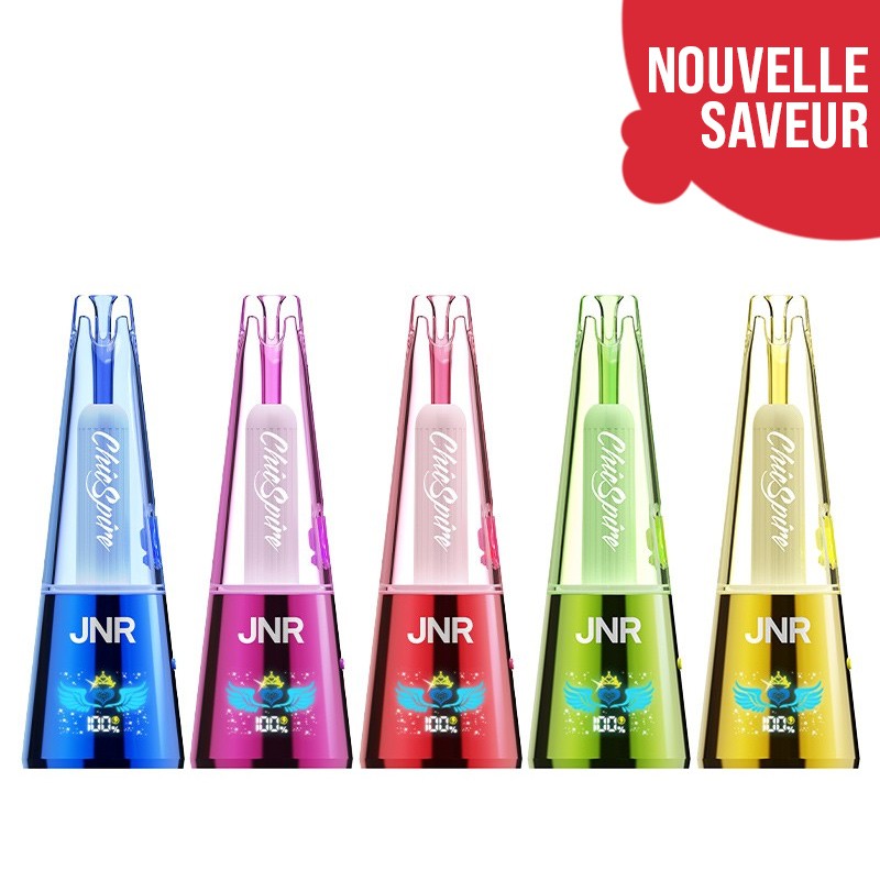Le Chicspire 26.5K de JNR offre jusqu’à 26 500 bouffées. Il inclut deux e-liquides, une lumière RGB, un flux d’air ajustable et un affichage intelligent du niveau et de la batterie. Sa batterie 900 mAh se recharge en Type-C. Équipé d’une résistance mesh 0.62 Ω et disponible en 6 saveurs, il est certifié TPD, sûr et conforme.
