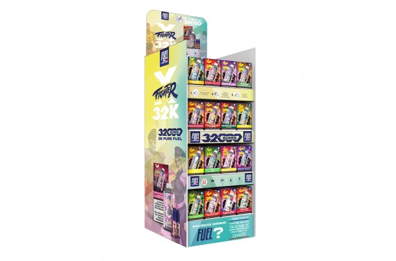 Pour soutenir le lancement des XFighter 32K, nous mettons à disposition de nos clients des outils de mise en avant dédiés : Une carte des saveurs XFighter 32K (chevalet) et un présentoir, afin de guider vos clients en magasin. Ces supports sont offerts à la demande, dans la limite des stocks disponibles.