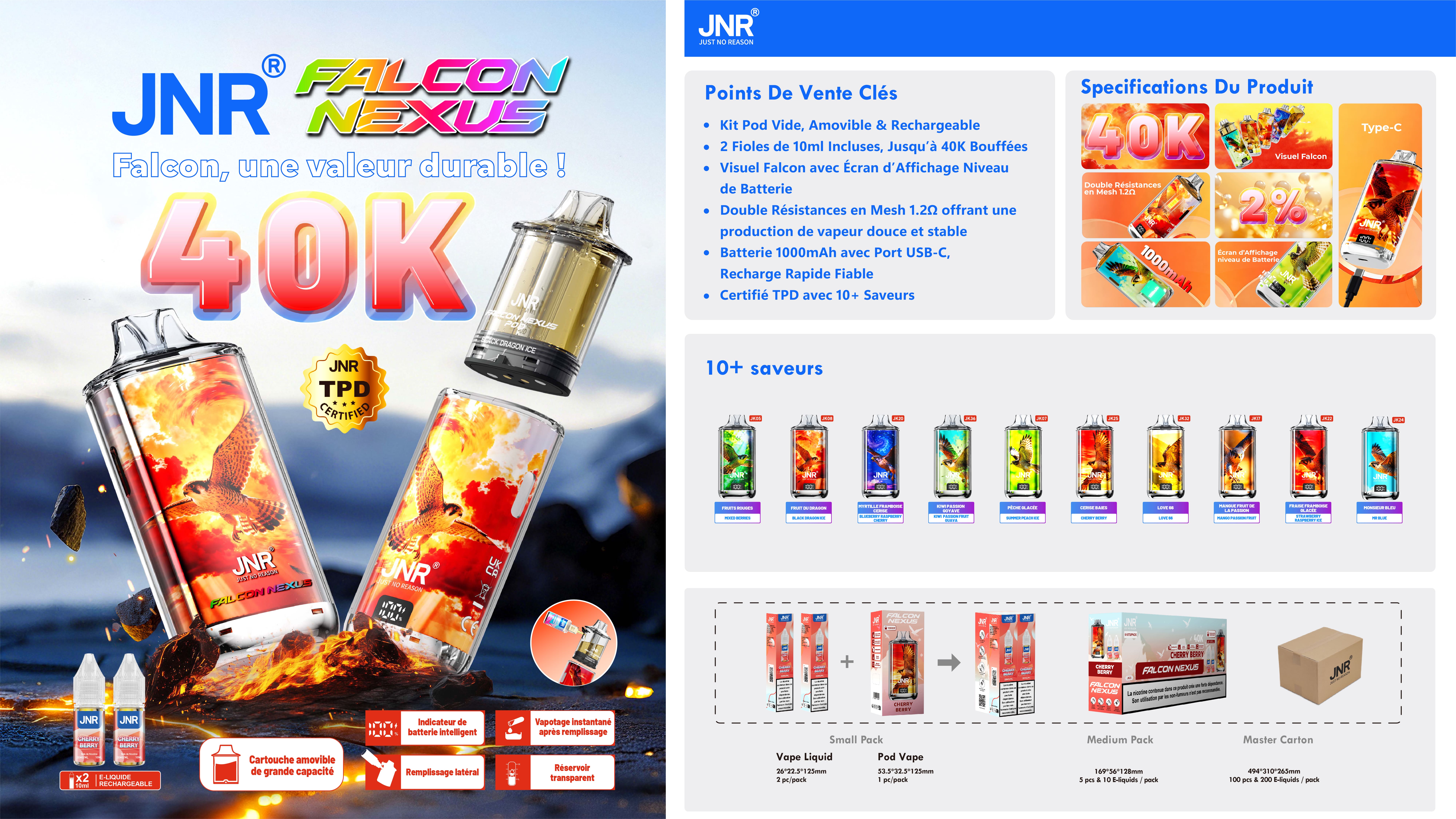 Avec son design signature JNR, ergonomique et contemporain, la Falcon Nexus 40K s’impose comme un dispositif durable, pratique et conforme TPD, idéal pour une vape longue autonomie maîtrisée.