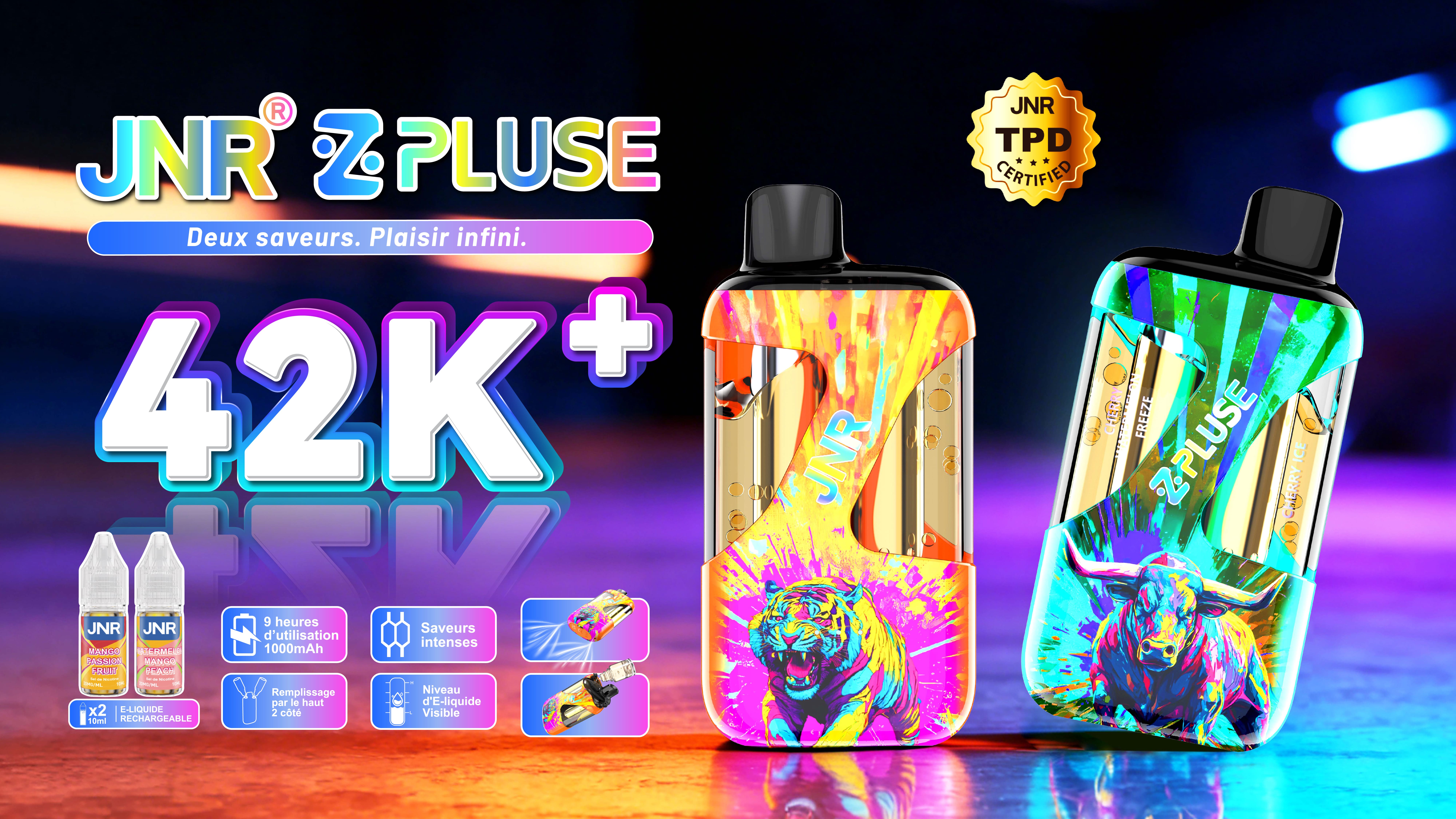 Le kit Pulse 42K de JNR est une cigarette électronique rechargeable conçue pour durer. Équipé de deux flacons de 10 ml, il offre jusqu’à 42 000+ bouffées. Son système double saveur avec embout rotatif permet de changer d’arôme à tout moment. Remplissage rapide par le haut, résistances Mesh double 0,6Ω pour un rendu optimal, batterie 1000 mAh rechargeable en USB-C, indicateurs lumineux et e-liquide visible. Nicotine 2 %, certifié TPD, disponible en plus de 10 saveurs.