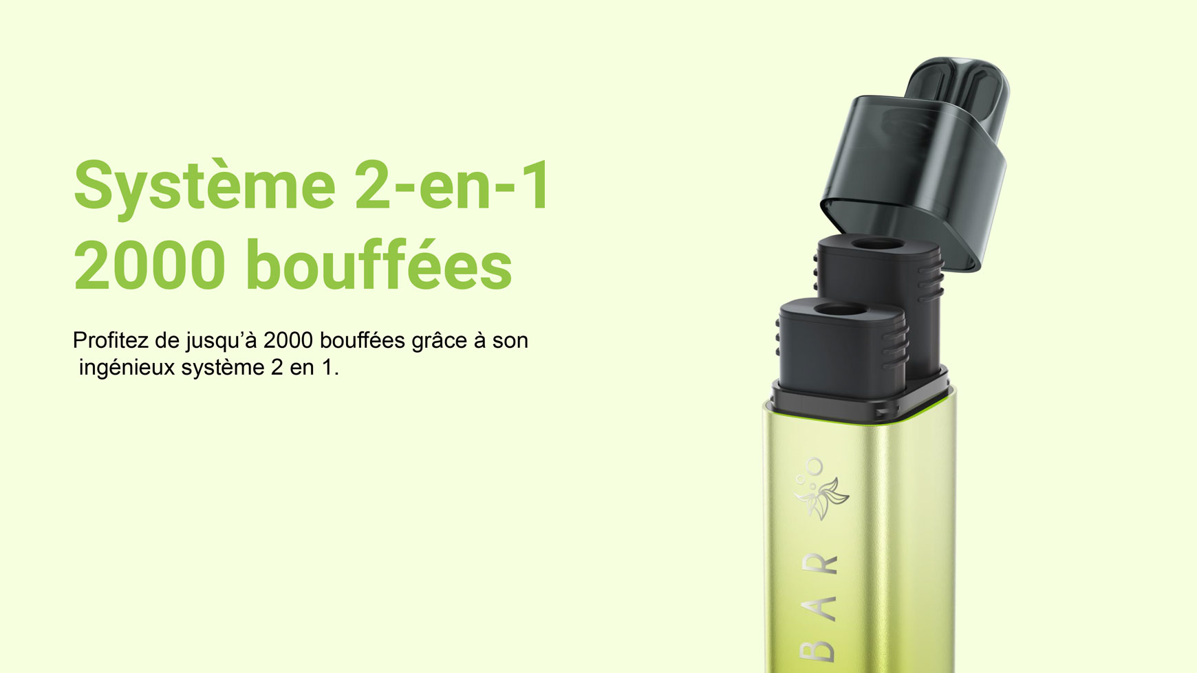 ELFBAR 2in1 offre jusqu’à 2000 bouffées avec deux pods pour deux fois plus de saveurs. Compact et coloré, il tient facilement en main ou en poche. Sa technologie QUAQ MESH assure un goût constant et une vapeur dense, soutenue par une batterie améliorée pour une chauffe stable. Disponible en 5 kits et 10 saveurs, il allie style et performance pour une vape de qualité.