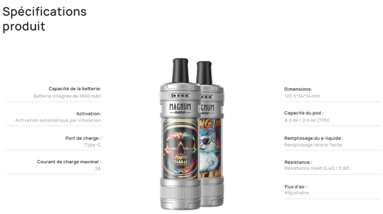 Le Magnum Nano est une cigarette électronique DTL et RDL portable, alimentée par une batterie de 1800 mAh avec charge rapide 2A.
