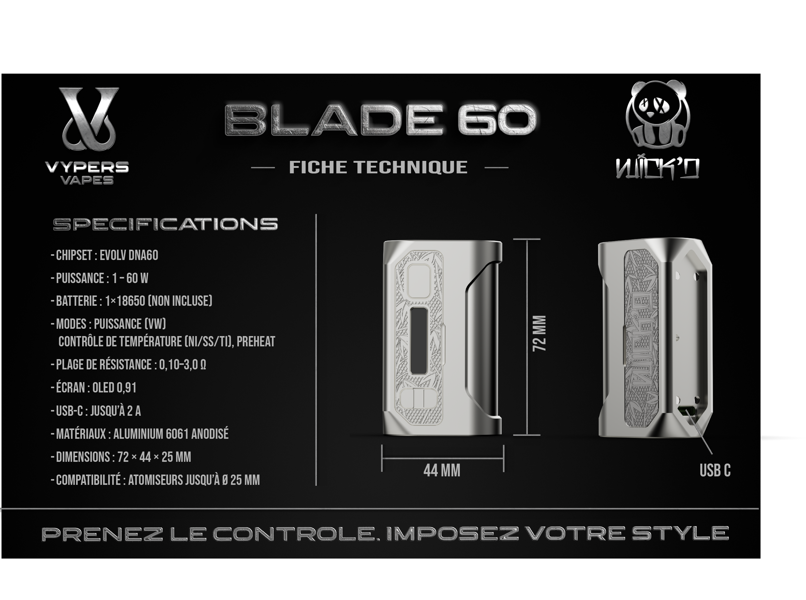 Conçu en France par Vypers Vapes, et fabriqué avec des partenaires industriels de référence en Chine suivant un cahier des charges strict (tests fonctionnels 100 % en fin de ligne, contrôle visuel & dimensionnel, CE et ROHS), Blade60 offre un niveau de finition et de fiabilité au-dessus des standards de son segment.