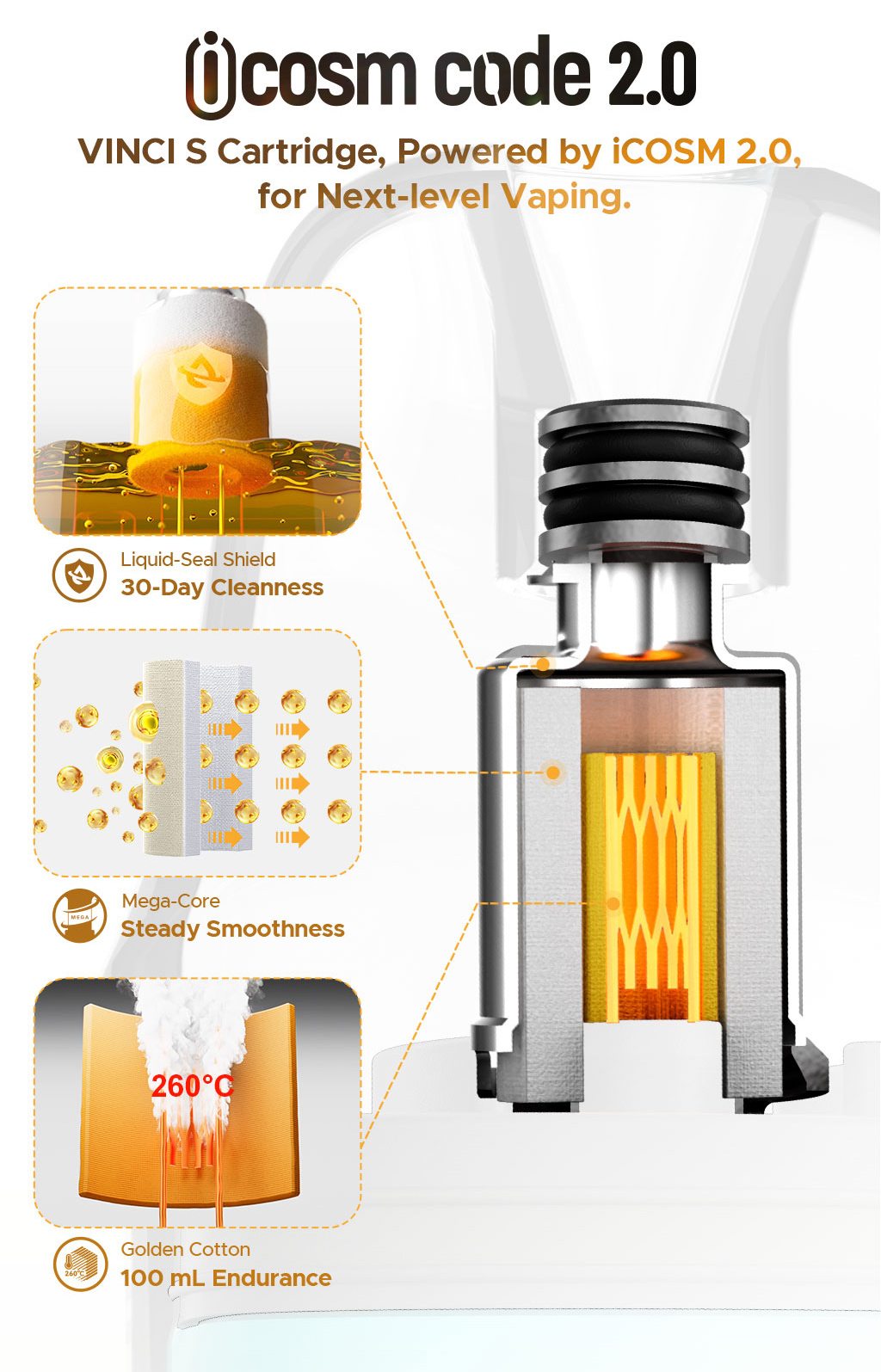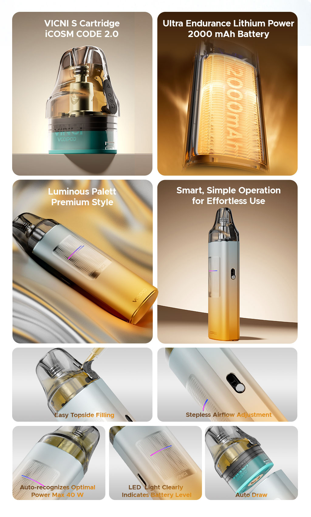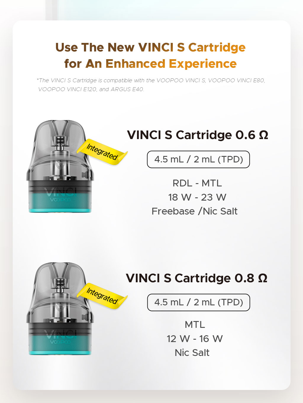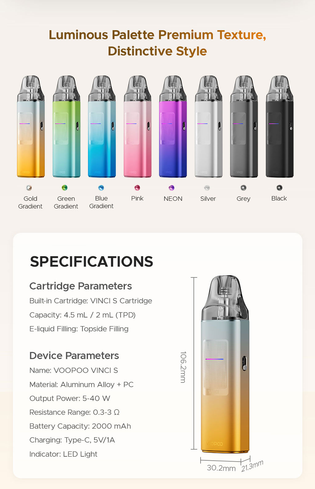 Découvrez le Vinci S de Voopoo, un pod compact et performant offrant jusqu’à 40W de puissance. Sa batterie intégrée de 2000mAh assure une excellente autonomie. Les cartouches Vinci S 4.5ml (résistances 0.6–0.8Ω) se remplissent facilement par le haut (Topside Filling). Profitez d’un airflow réglable pour un tirage personnalisé, du MTL au RDL. Design élégant, vape puissante et pratique au quotidien !