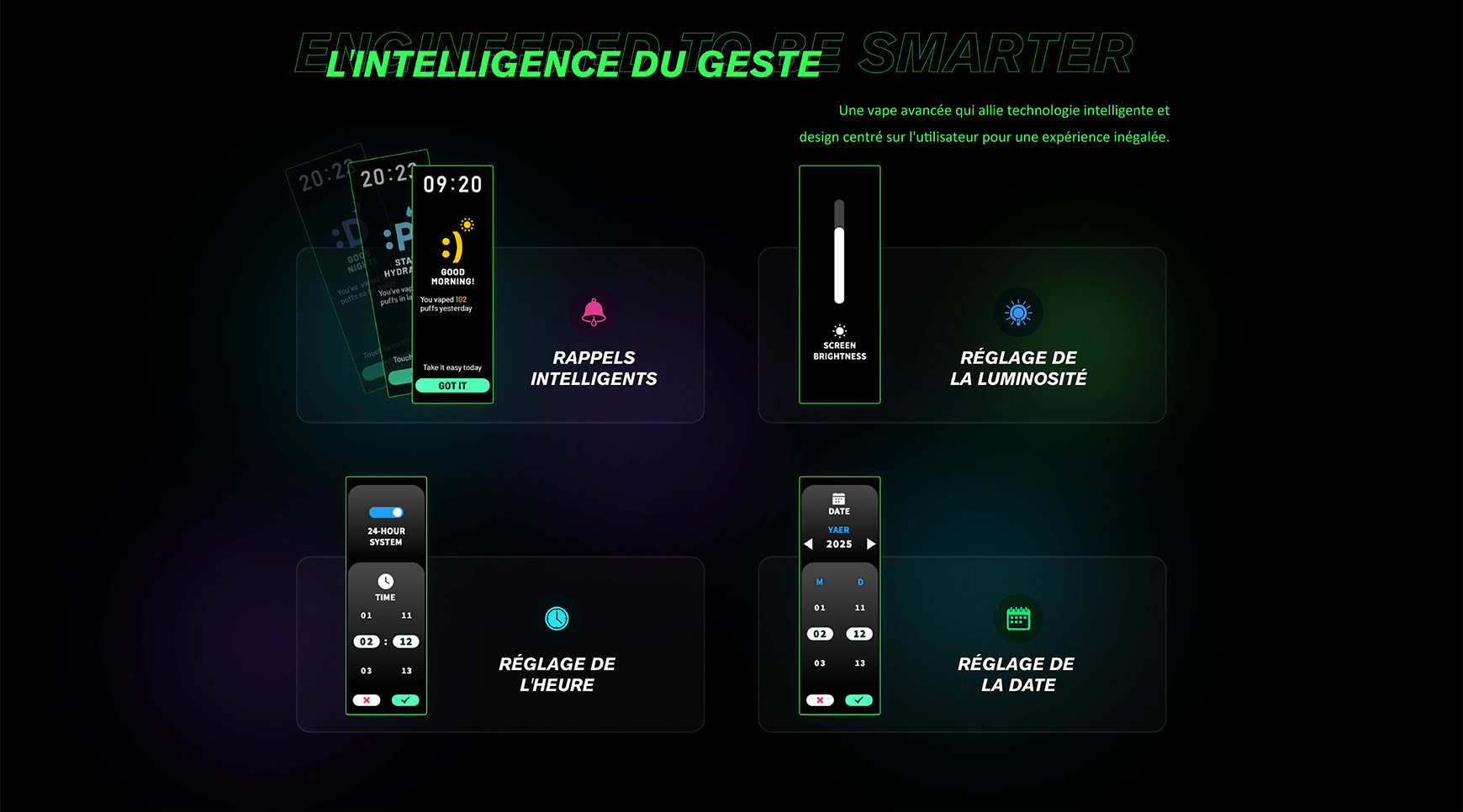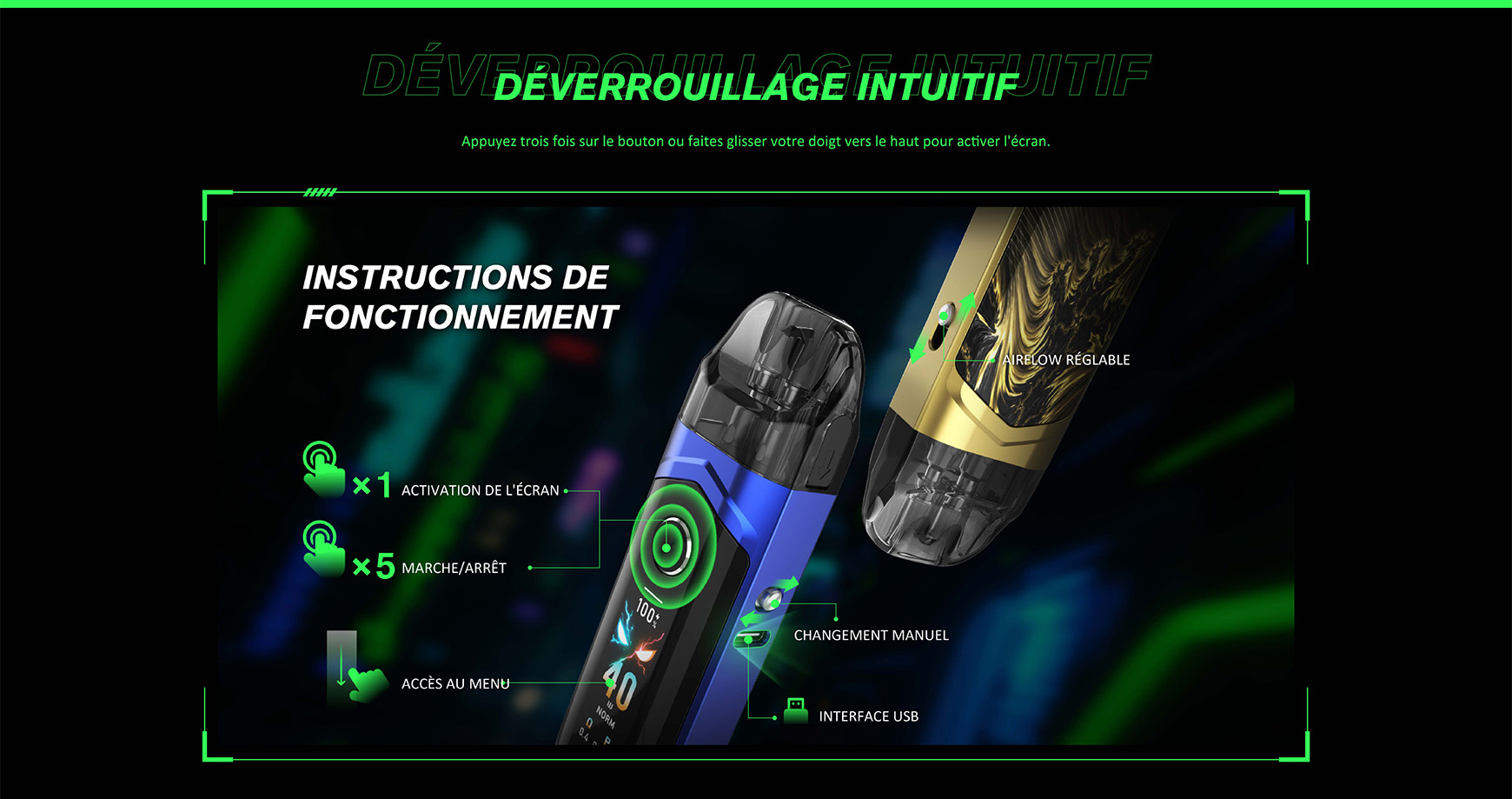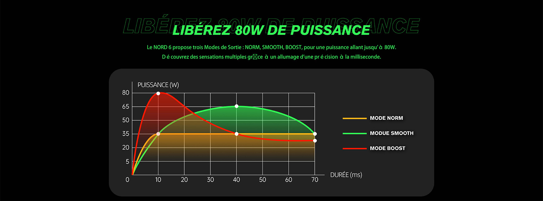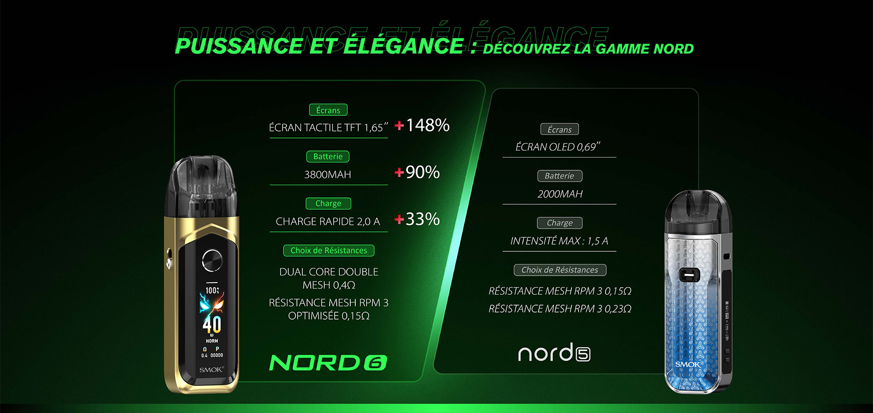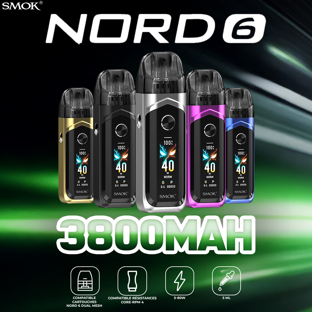 Doté de deux cartouches animées par la technologie Double Core Double Mesh et la nouvelle Résistance RPM 4, le NORD 6 génère sans effort une saveur intense etune vapeur riche. Grâce à son écran tactile HD 1,65", sa batterie extra-large de 3800mAh et sa charge rapide 2.0A, personnalisez votre vape de 5 à 80W avec trois modes de sortie, suivez votre consommation et profitez pleinement de sa capacité de 5ml.