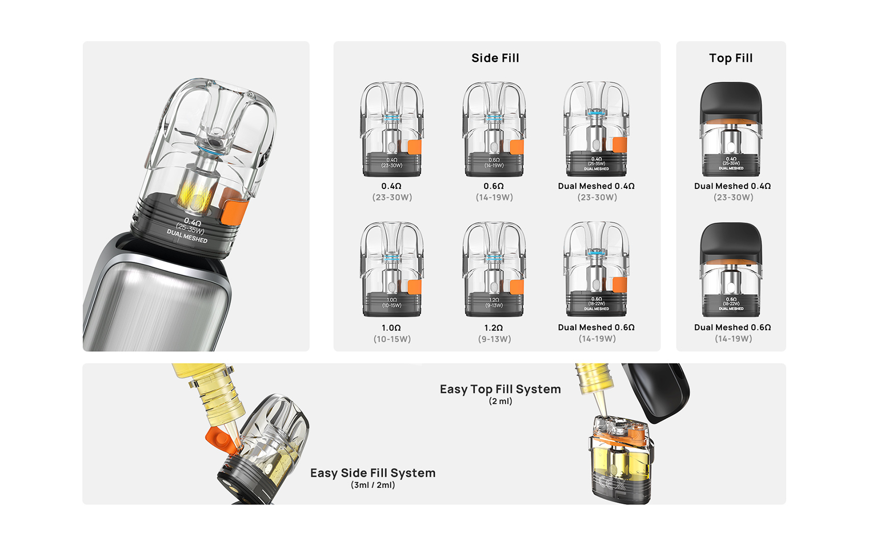 Les versions dual mesh apportent un boost de vapeur et une restitution aromatique plus intense, tandis que les versions mesh classiques proposent une vape plus douce et maîtrisée.
