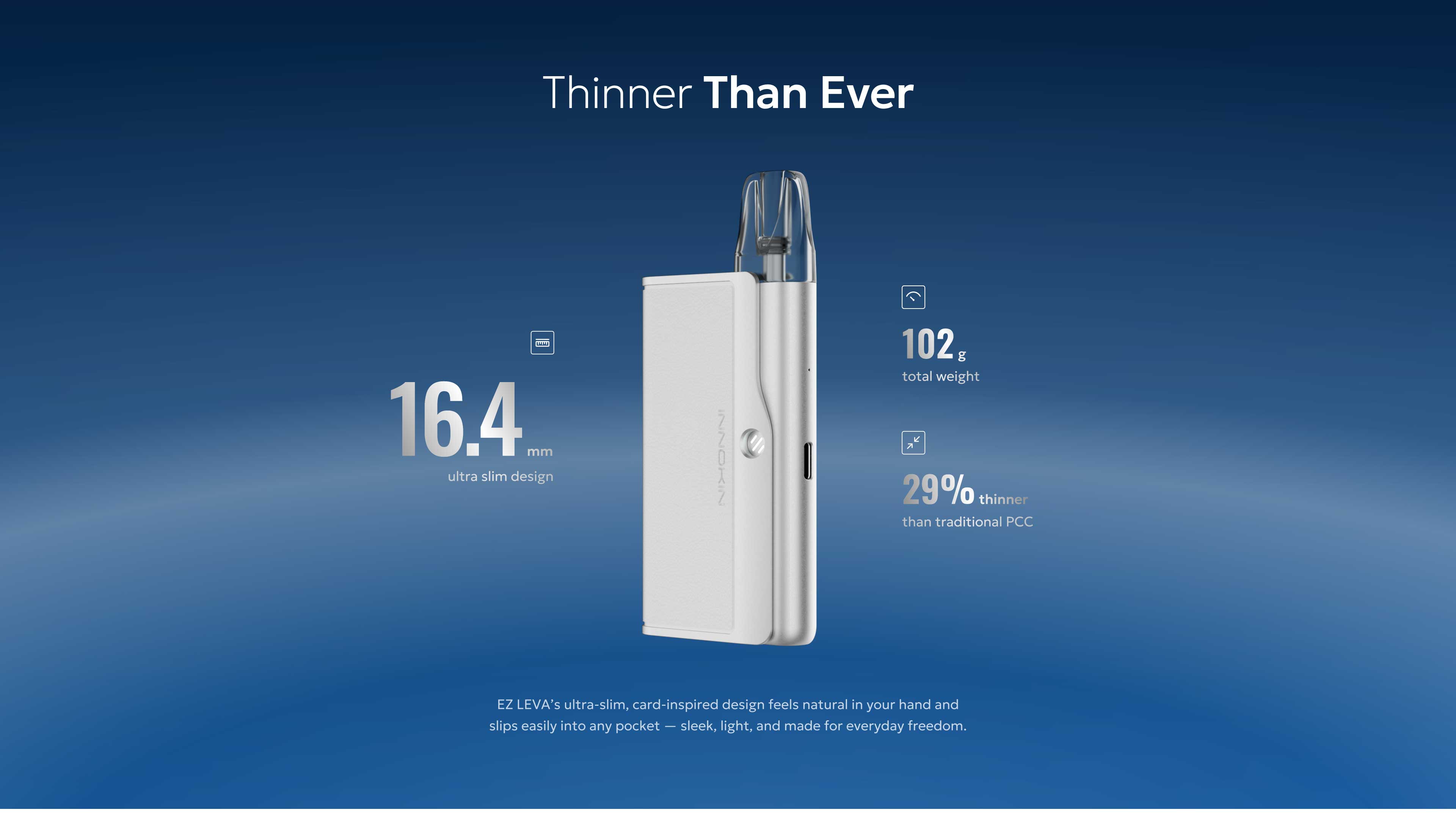 nspiré d’une carte, le Kit EZ Leva Innokin est 29 % plus fin qu’une station de charge traditionnelle. Avec 16,4 mm d’épaisseur et un poids total d’environ 102 g, il se glisse discrètement dans une poche ou un sac.