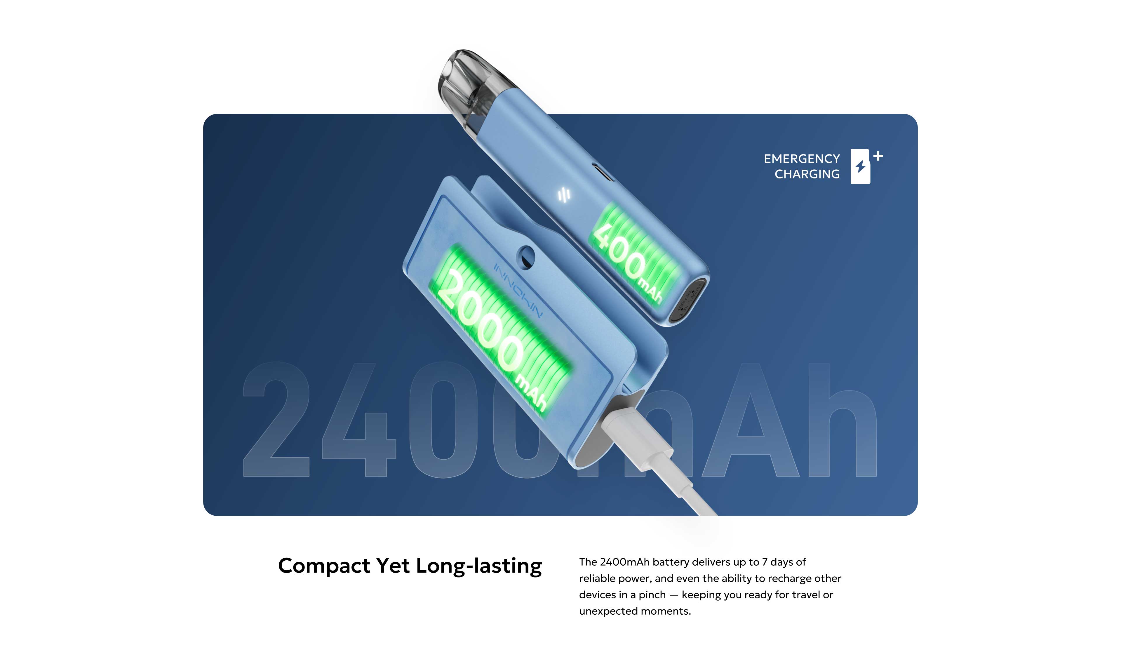L’autonomie totale du kit atteint 2400 mAh (400 mAh dans le pod + 2000 mAh dans la station).