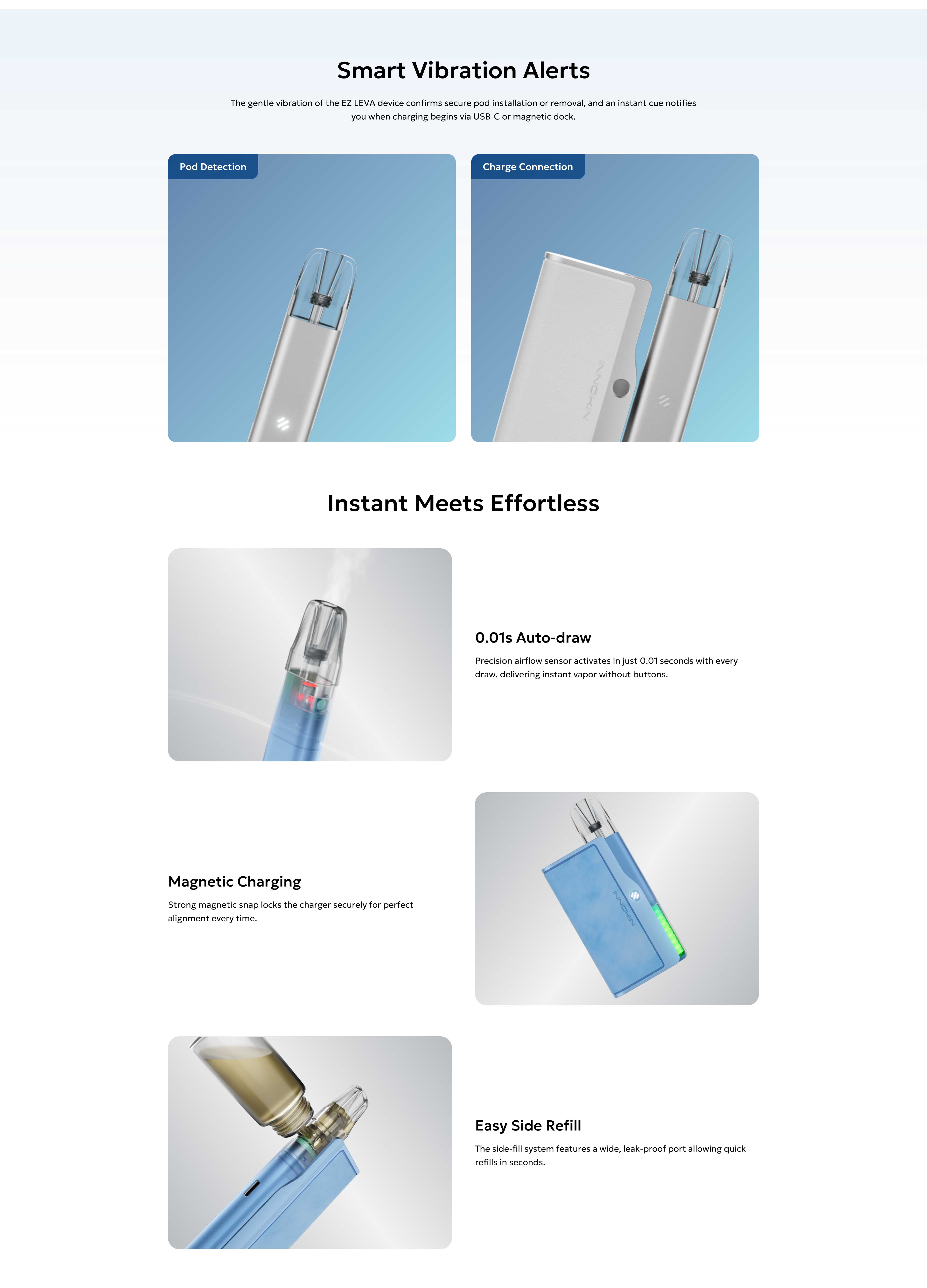 Le Kit EZ Leva d’Innokin révolutionne la vape nomade. Avec son format carte ultra-fin, son pod automatique et sa station magnétique de batterie 2400 mAh, ce produit offre une utilisation intuitive, une autonomie géante et un vrai tirage MTL serrée, pensé pour les vapoteurs qui souhaitent retrouver des sensations proches de la cigarette traditionnelle au tabac.