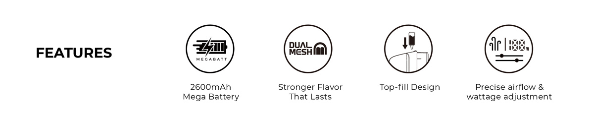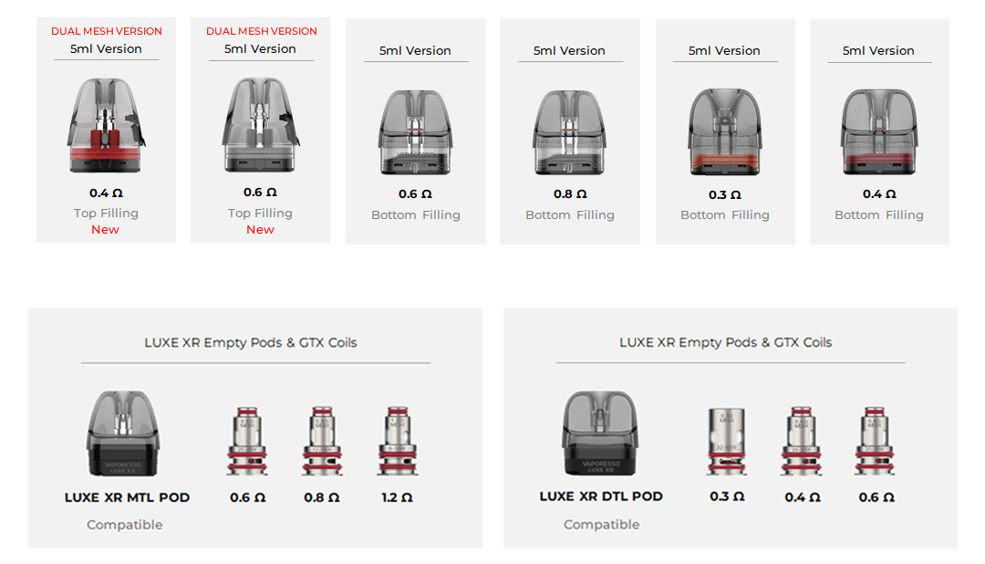 Le Luxe X3 est compatible avec les cartouches Luxe X Dual Mesh de 5ml, tout en acceptant l’ensemble des cartouches Luxe X Series et Luxe XR. Les nouvelles cartouches Vaporesso garantissent des saveurs encore plus intenses et une durée de vie améliorée, avec des résistances de 0,4Ω et 0,6Ω.