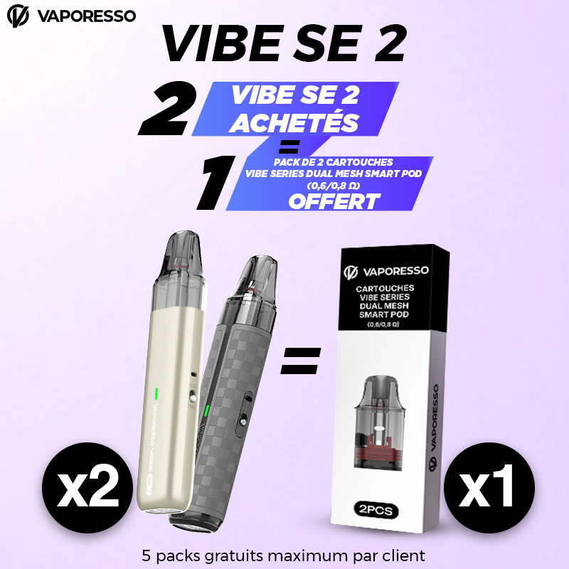 Découvrez le Vaporesso Vibe SE 2 : pod compact et simple d’utilisation, équipé d’une batterie 1400 mAh pour une excellente autonomie et d’une cartouche 4,5 ml Dual Mesh pour une restitution optimale des saveurs.