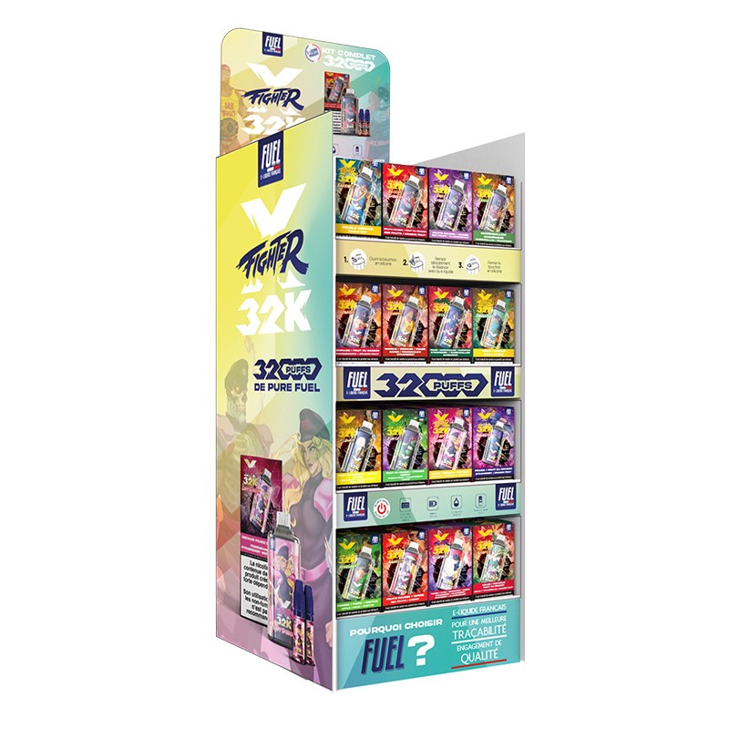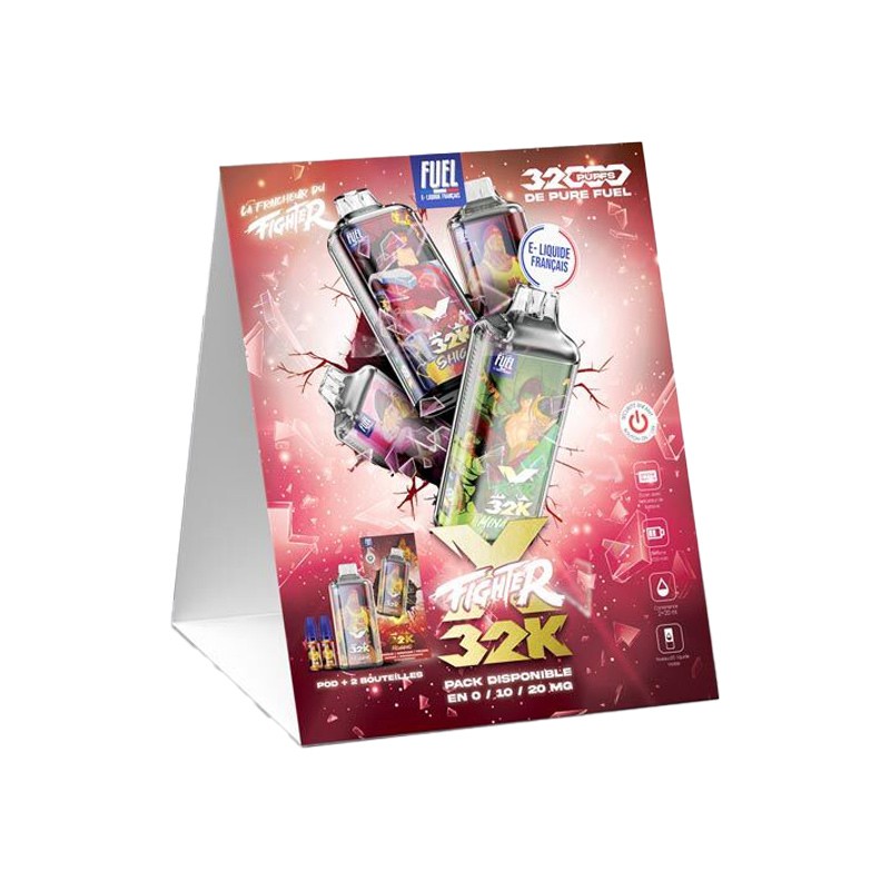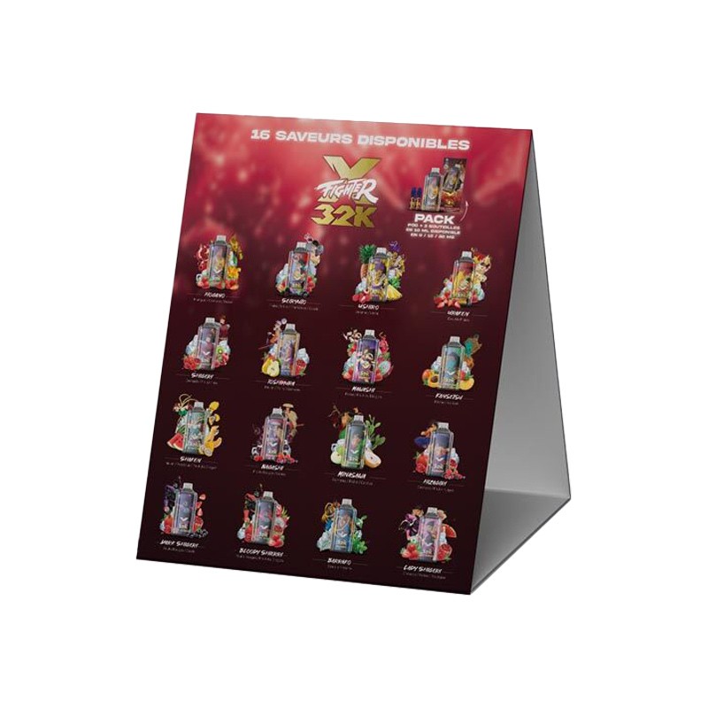 Pour soutenir le lancement des XFighter 32K, nous mettons à disposition de nos clients des outils de mise en avant dédiés : Une carte des saveurs XFighter 32K (chevalet) et un présentoir, afin de guider vos clients en magasin. Ces supports sont offerts à la demande, dans la limite des stocks disponibles.